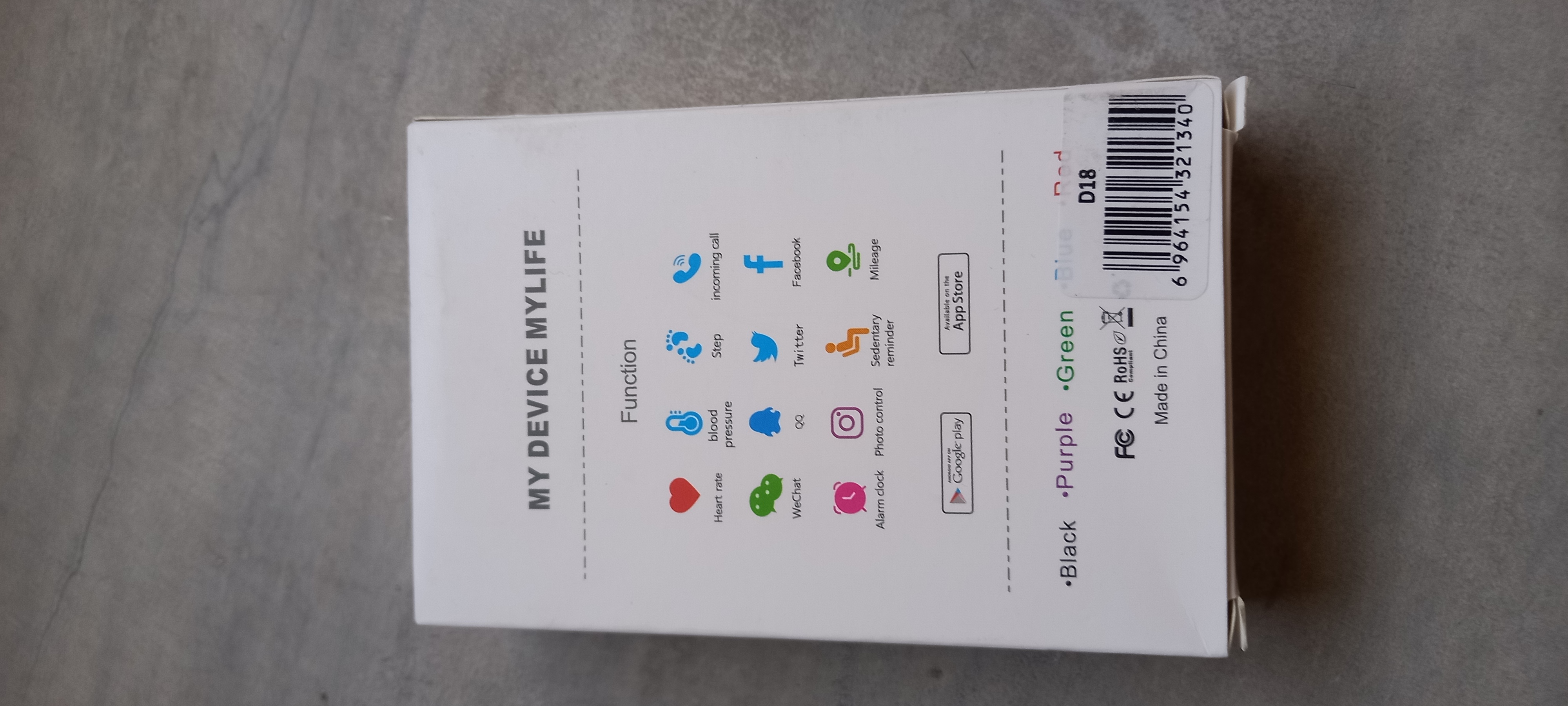 Función Pasos de ejercicio, consumo de calorías, cálculo de distancia, monitorización de frecuencia cardíaca, monitorización de presión arterial, monitorización del sueño, recordatorio de mensajes, recordatorio de llamadas, control remoto de fotos, recordatorio de aplicaciones (Facebook, Twitter, Instagram, WhatsApp, Wechat, QQ, etc.)
